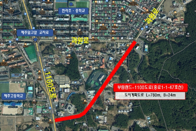 본 도로는 부림랜드 앞에서 제주고 정문 남측을 연결하는 길이 780m, 폭 24m의 도시계획도로로 사업비 171억 원(공사비 48억 원, 보상비 123억 원)을 투입해 지난 2020년 3월 공사 착공 후 2023년 12월 사업을 완료했다.