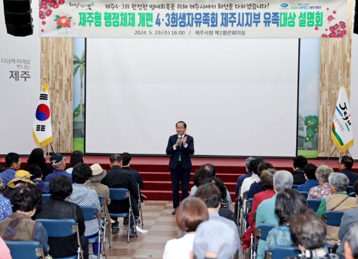 제주4.3희생자유족회 제주시지부 회원 200여 명을 대상으로 제주형 행정체제 개편 도입 배경과 개편 사항, 향후 로드맵 등을 설명하면서 참여자들의 이해도를 높이고, 관심을 이끌었다.