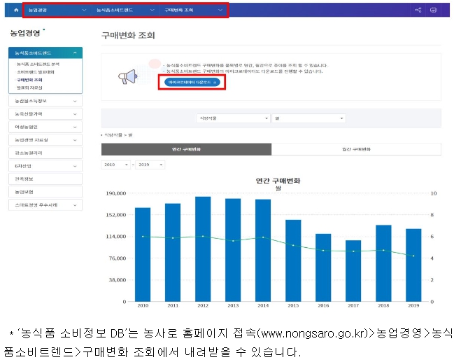쌀의 경우 백미, 찹쌀, 현미, 흑미 등 13개 소분류로 세분화해 전체 구매량과 상하반기, 월간 구매량 등을 제공함으로써 시대 흐름에 따른 소비 동향을 알 수 있게 했다.
