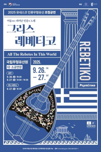 국립무형유산원은 인류무형유산의 가치를 널리 알리고, 이해와 공감을 넓히기 위해 2014년부터 매년 유네스코 인류무형유산 등재 종목을 초청하여 공연을 이어왔다. 올해는 그리스의 대표적 민중음악인 ‘레베티코(Rebetiko)’를 소개한다.