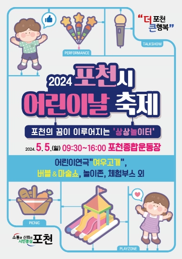 [뉴스서울] 포천시는 제102회 어린이날을 맞이해 오는 5월 5일 포천종합운동장에서 ‘포천의 꿈이 이루어지는 상상놀이터’ 라는 부제로 '2024년 포천시 어린이날 축제'를 개최한다.