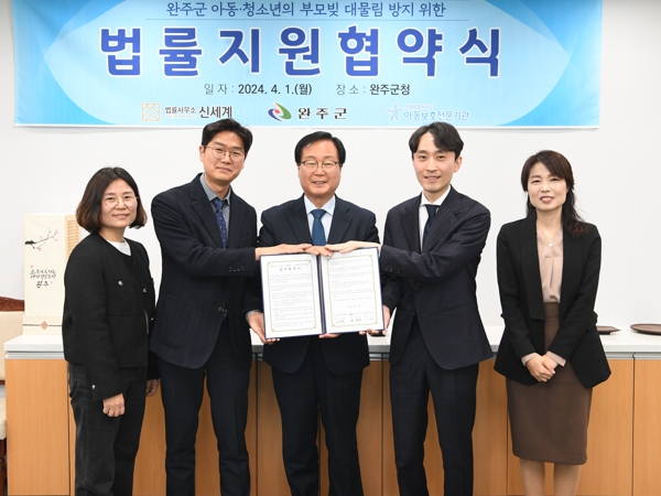 지난 1일 완주군은 법률사무소 신세계, 전북특별자치도 아동보호전문기관과 부모 빚 대물림 방지 법률지원 업무협약을 체결했다.