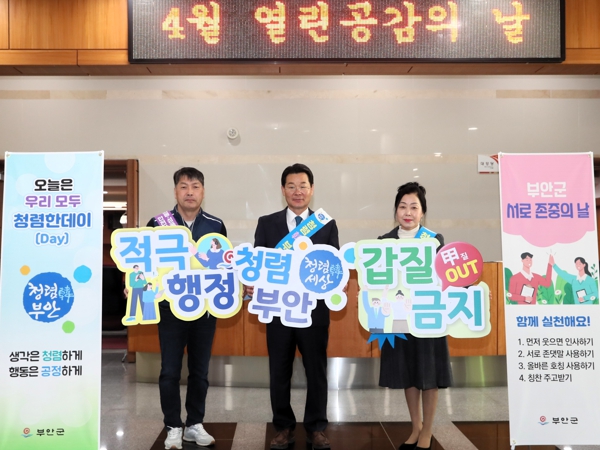 [뉴스서울] 부안군은 2일 개최한 4월 열린 공감의 날 행사에서 전 직원을 대상으로 ‘우리 모두 청렴한 데이(Day)+서로 존중의 날’ 문화 캠페인을 전개했다.