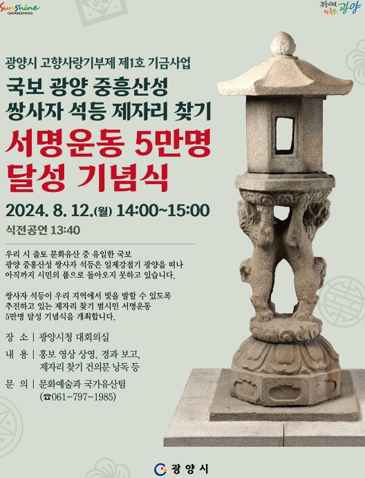 [뉴스서울] 광양시는 '광양시 고향사랑기부제 제1호 기금사업'으로 선정된 ‘국보 광양 중흥산성 쌍사자 석등 제자리 찾기 사업’의 범시민 서명운동 5만 명 달성을 기념해 시민들과 함께하는 기념식을 오는 12일 14시 시청 대회의실에서 개최한다고 밝혔다.
