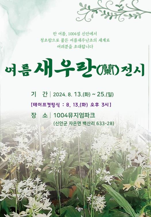 [뉴스서울] 신안군은 오는 8월 13일부터 25일까지 자은면 새우란전시관(1004뮤지엄파크)에서 새우란 중 유일하게 한여름에 피어나는 여름새우란을 전시한다고 밝혔다.