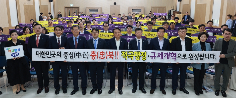 끝으로 대형 글자판과 미니현수막을 이용한 퍼포먼스를 펼치며 적극행정과 규제개혁으로 대한민국의 중심 충북을 완성하겠다는 강력한 의지를 다졌다.