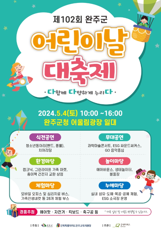이번 어린이날 행사는 완주군과 완주교육지원청이 공동으로 주최하고 굿네이버스 전북지역본부가 주관한다.