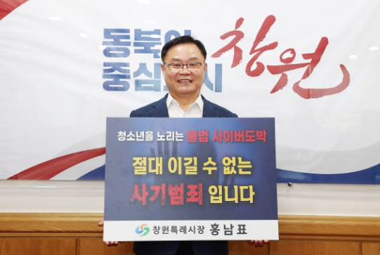 시에 따르면, 홍남표 창원특례시장이 시장 집무실에서 ‘청소년을 노리는 불법 사이버도박 절대 이길수 없는 사기 범죄입니다’라는 문구가 적힌 손팻말을 들고 인증 사진을 촬영했다.