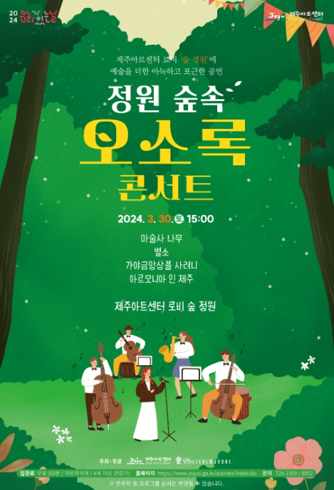 [뉴스서울] 제주아트센터는 문화가 있는 날 행사로 올해 상반기 중 3회에 걸쳐 진행되는 '정원 숲속 오소록 콘서트'의 두 번째 공연을 3월 30일 오후 3시에 개최한다.