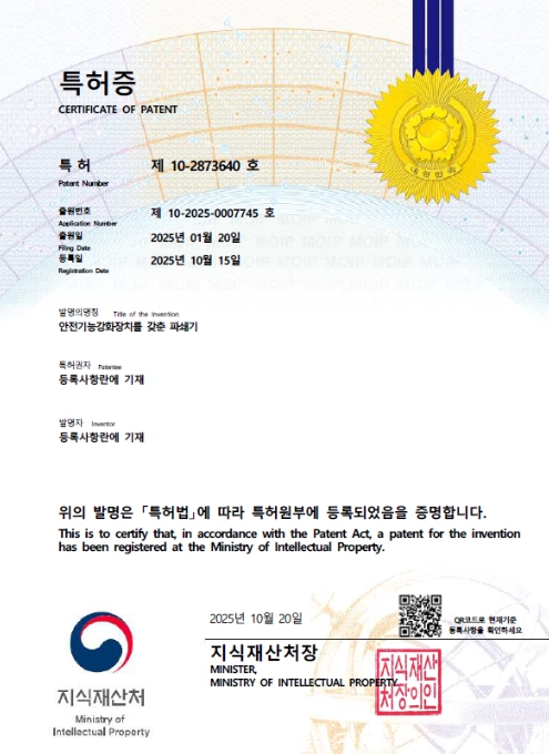 [뉴스서울] 제주특별자치도 농업기술원은 ㈜한성티앤아이와 공동으로 개발한 무선인식(RFID) 기반 안전기능 강화 장치를 갖춘 파쇄기 기술이 기술개발 특허로 등록됐다고 밝혔다.