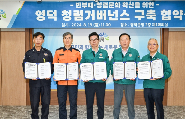 [뉴스서울] 영덕군과 영덕군의회, 영덕교육지원청, 영덕경찰서, 영덕소방서 등의 관내 공공기관들이 청렴을 최우선 가치로 삼는 건강한 지역사회를 실현하기 위해 지난 19일 ‘청렴 거버넌스 구축 협약식’을 체결했다.