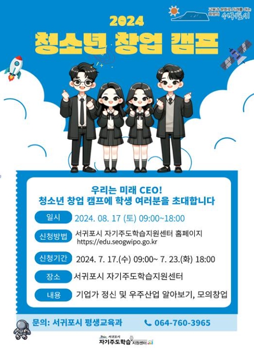 [뉴스서울] 서귀포시는 관내 중학생을 대상으로 '2024년 청소년 창업캠프 프로그램' 참여자 30명을 7월 17일부터 7월 23일까지 서귀포시 자기주도학습지원센터 홈페이지를 통해 선착순으로 모집할 예정이다.
