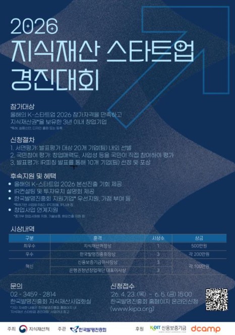 [뉴스서울] 지식재산처는 신용보증기금, 은행권청년창업재단(디캠프), 한국발명진흥회와 함께 4월 23일 ~ 6월 5일까지'2026 지식재산 스타트업 경진대회'참가기업을 모집한다고 밝혔다.