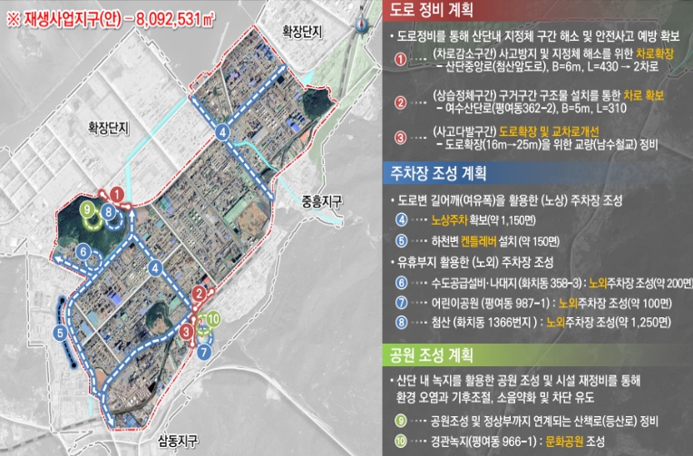 한편, 동 사업은 토지이용계획 변경, 기반시설 확충・개량을 통한 인프라 개선, 업종배치계획 재수립 등으로 노후화된 산업단지 재정비 및 활성화를 도모하는 사업이다.