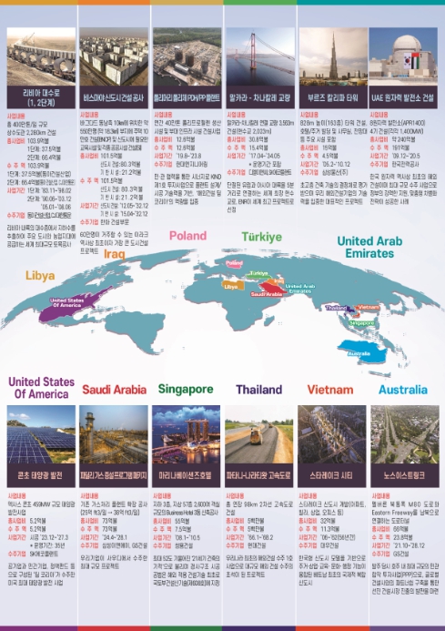 역대 수주실적으로는 1위는 UAE 원자력 발전소(191.3억 달러, 2009), 2위 이라크 비스마야 신도시(80.3억 달러, 2012), 3위 사우디아라비아 파딜리 가스 증설 프로그램(73.0억 달러, 2024), 4위 쿠웨이트 클린 퓨얼 프로젝트(72.9억 달러, 2014), 5위 이라크 카르발라 정유공장 프로젝트(68.4억 달러, 2014) 순이다.