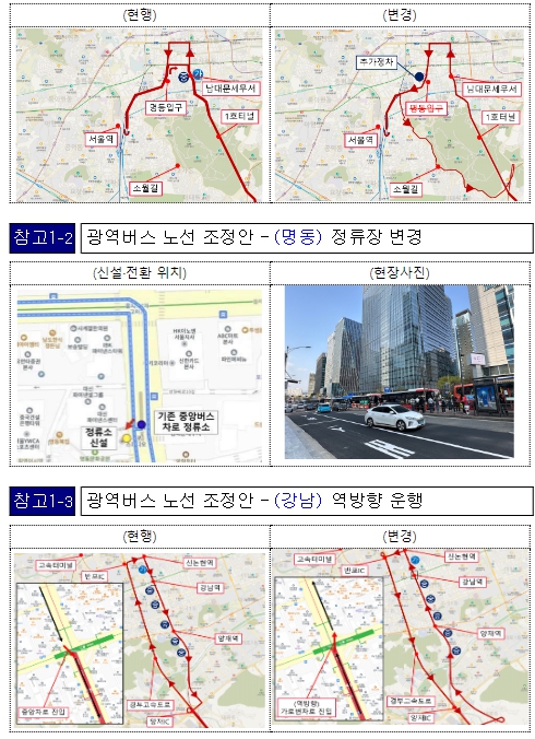 주요 조정안의 내용으로는, 명동의 경우 △회차경로 조정(2개 노선, 남산1호터널→소월길, 6.29~) 및 △가로변 정류장 신설·전환(11개 노선, ‘남대문세무서’→‘명동성당’, 5.16~), 강남은 △역방향 운행(5개 노선, 중앙차로 하행→상행, 6.29~)과 △운행차로 전환(15개 노선, 중앙→가로변, 6.29~) 등이다.