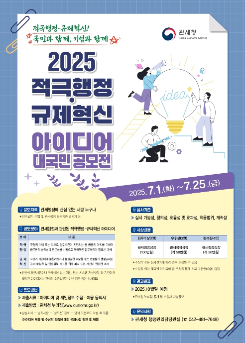[뉴스서울] 관세청은 공직 내 적극행정 문화를 확산하고 불합리한 규제를 개선하기 위해 “국민과 함께, 기업과 함께”를 표어로 '2025 적극행정·규제혁신 아이디어 대국민 공모전'을 개최한다고 밝혔다.