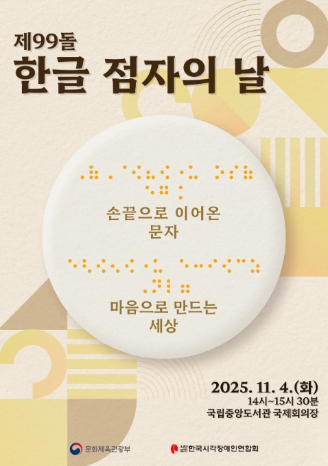 [뉴스서울] 문화체육관광부는 한국시각장애인연합회와 함께 11월 4일 오후 2시, 국립중앙도서관에서 ‘제99돌 한글 점자의 날’ 기념식을 개최한다.
