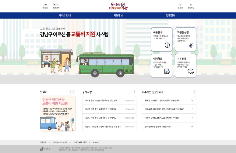 이 사업은 관내 거주하는 65세 이상 어르신(기준 중위소득 120% 이하)과 6세~18세 청소년·어린이가 서울 지역을 운행하는 시내·마을버스를 이용할 경우 분기별 한도 범위 내에서 사용한 교통비를 돌려주는 사업이다. 경기버스, 광역버스, 공항버스, 시외버스 등은 해당되지 않는다. 타 자치구에서 어르신 대상으로 교통비를 지원하는 사업이 있지만 교통약자인 어르신·청소년·어린이 모두에게 버스비를 지원하는 것은 강남구가 처음이다. 이 사업의 수혜 대상은 강남구 전체 구민의 26%인 13만 7300여명이다.