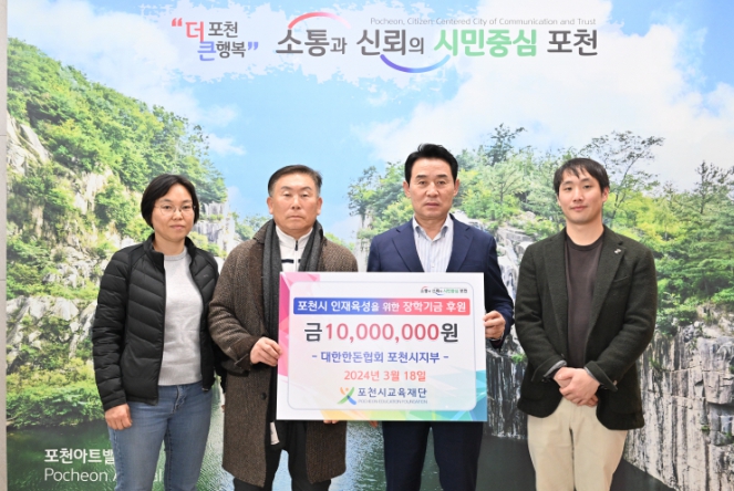 [뉴스서울] (재)포천시교육재단은 지난 18일 대한한돈협회 포천시지부에서 1천만 원, ㈜GS포천그린에너지 임직원 일동이 188만 원의 장학금을 기탁했다고 밝혔다.