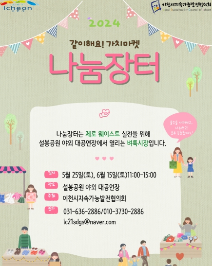 나눔장터는 자원 재활용을 통해 낭비를 막고 환경보호와 나눔의 가치를 실현하는 벼룩시장으로 가족이나 비영리 단체(영리상인 참여 불가) 등 다양한 참가자가 재사용 가능 물품을 판매하거나 교환하는 행사이며, 이번 장터는 이천시지속가능발전협의회에서 주관하여 진행한다.