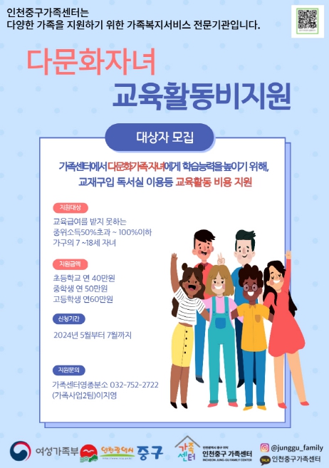 [뉴스서울] 인천중구가족센터 영종분소는 ‘2024년도 다문화자녀 교육활동비 지원사업’을 추진, 지원 대상자를 모집한다고 26일 밝혔다.