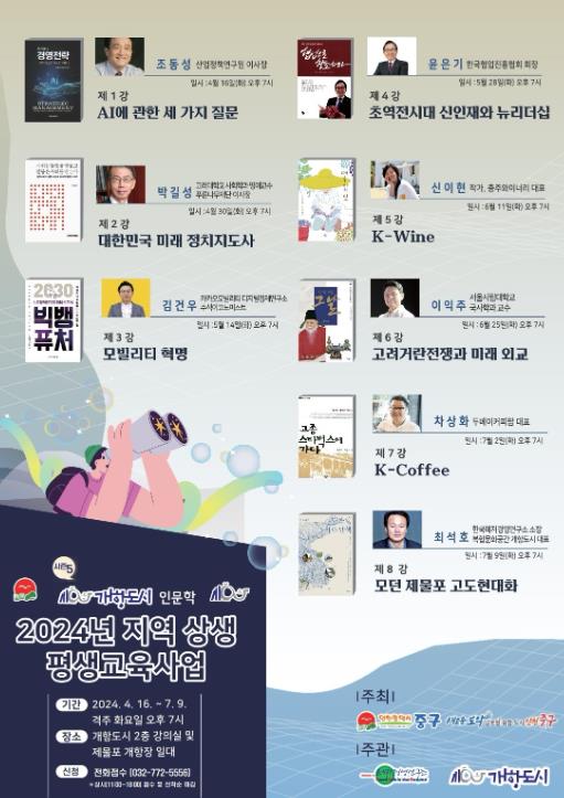 올해 ‘개항도시 인문학’은 주민들의 인문학적 소양을 강화하기 위해 추진되는 만큼, 미래산업, 역사, 리더십, 와인, 커피 등 다양한 분야의 명성 높은 저자들의 직강으로 구성됐다.