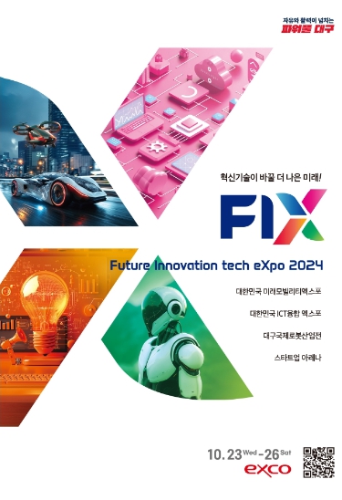 2024 미래혁신기술박람회(Future Innovation tech eXpo 2024, 이하 FIX 2024)는 UAM(도심항공교통) 등 미래모빌리티, 로봇, AI(인공지능), 반도체 등 최신기술을 한자리에서 확인할 수 있는 ‘혁신기술 통합플랫폼’으로서, 오는 10월 23일(수)부터 26일(토)까지 4일간 대구 엑스코 전관에서 개최된다.