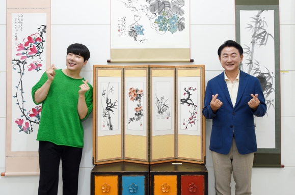 | ▲ 김동근 시장이 7월 1일 시청 시민갤러리에서 전시를 진행하는 비니쌤과 기념사진을 찍고 있다. |
