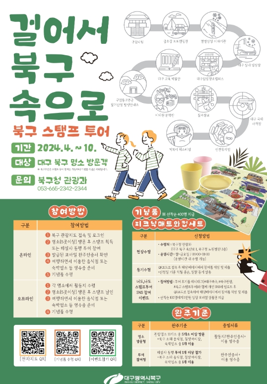 [뉴스서울] 대구 북구청은 오는 4월 15일부터 10월까지 북구 곳곳을 여행하며 지역의 역사와 문화를 체험함과 동시에 여행의 재미를 더할 수 있는 '걸어서 북구 속으로!' 관광명소 스탬프 투어를 운영한다.