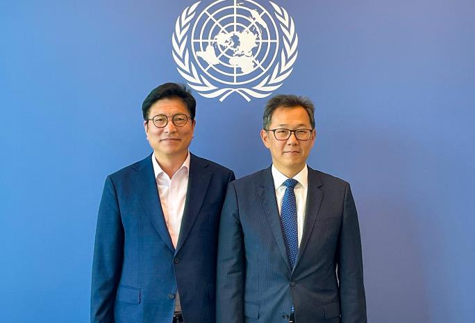 ▲ 도성훈 교육감이 장욱진 UN 본부 경제사회국장과 기념 촬영을 하고 있다 |