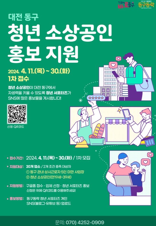[뉴스서울] 대전 동구는 청년공간 동구동락과 함께 새롭게 추진하는 ‘청년 소상공인 홍보 지원사업’에 참여를 희망하는 20개 업체를 모집한다고 11일 밝혔다.