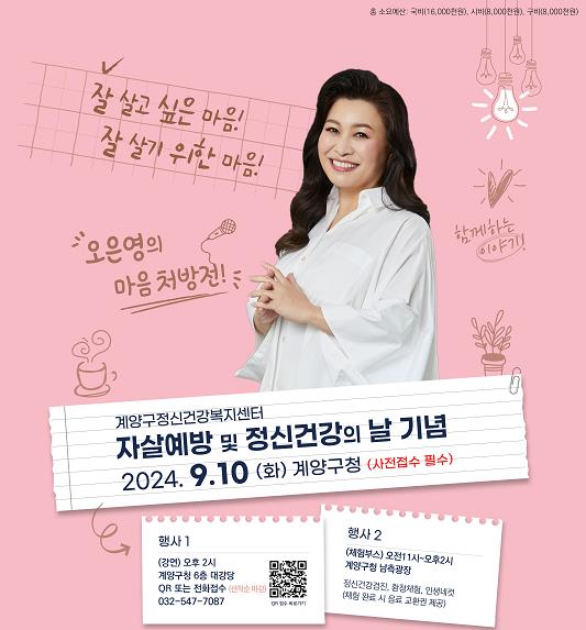 [뉴스서울] 인천광역시 계양구가 ‘자살예방 및 정신건강의 날’을 기념해 오는 9월 10일 오후 2시 계양구청 대강당에서 ‘오은영의 마음처방전’ 강연 행사를 개최한다고 밝혔다.