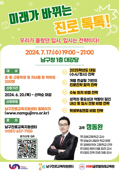 [뉴스서울] 부산 남구는 오는 7월 17일 오후 7시, 초·중·고등학생과 학부모 200명을 대상으로 남구청 대강당에서‘미래가 바뀌는 진로 톡톡! 우리가 몰랐던 입시, 입시는 전략이다!’라는 제목으로 진로·진학 토크콘서트를 개최한다.