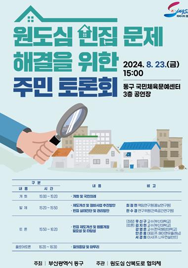 [뉴스서울] 부산 동구는 부산 동구‧원도심 산복도로 협의체(중구 서구 동구 영도구 부산진구) 주최‧주관으로 8월 23일 오후 3시, 동구 국민문예체육센터 3층 공연장에서 “원도심 빈집 문제 해결을 위한 주민 토론회”를 개최한다고 밝혔다.