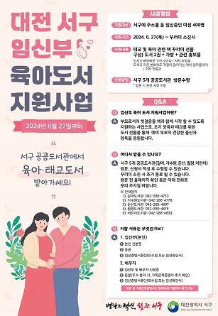 신청 대상은 주소지가 대전 서구인 임신 중인 여성으로, 본인 또는 배우자가 관련 서류를 지참하여 서구 공공도서관을 방문하면 책 꾸러미를 받을 수 있다.