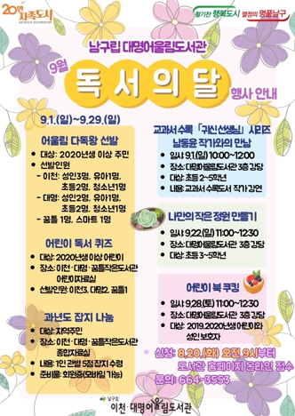 독서의 달 행사와 관련된 사항은 남구립도서관 누리집 또는 SNS를 확인하거나 전화로 문의하면 된다.