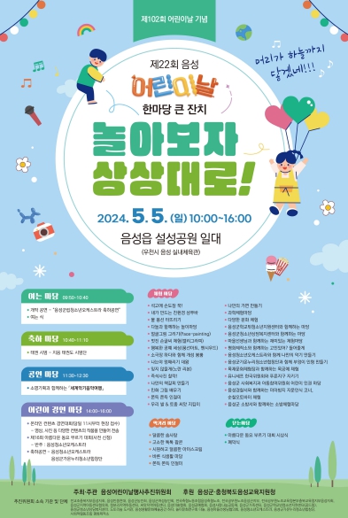 이번 행사는 음성어린이날행사추진위원회가 주관해 ‘놀아보자 상상대로!’라는 부제로, 어린이와 가족이 함께 즐길 수 있는 공연마당, 체험마당, 먹거리마당, 경연마당 등으로 운영된다.