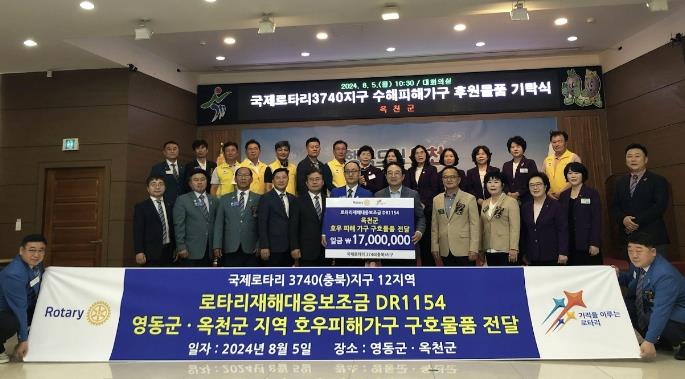 이날 기탁식에는 옥천로타리클럽(회장 이용수)과 옥천청담로타리클럽(회장 유복여) 회원들이 함께 참석해 수재민의 빠른 일상 회복을 응원했다.