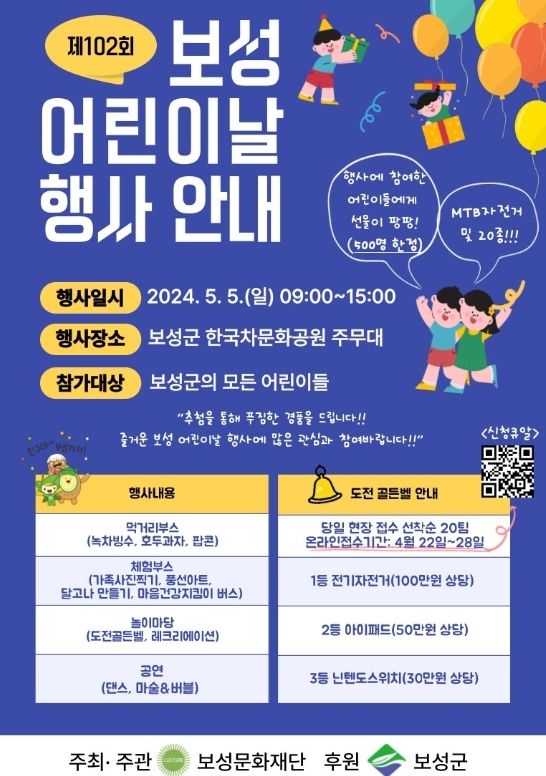 이번 어린이날 행사는 제47회 보성다향대축제 기간에 열리며 (사)보성문화재단이 주관한다.