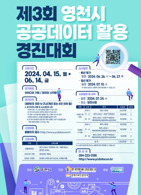 [뉴스서울] 영천시는 공공데이터 활용을 통한 아이디어 발굴과 데이터 시각화로 데이터 경제 활성화의 장을 마련하고자 오는 4월 15일부터 6월 14일까지 ‘2024년 제3회 영천시 공공데이터 활용 경진대회’를 개최한다.
