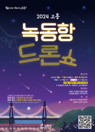 한편, 군 관계자는 드론쇼 공연은 녹동항 어디서나 관람이 가능하고, 매주 토요일 저녁 우천 등 기상악화로 공연이 연기되거나 취소될 수 있으니, 사전에 고흥군 대표 누리집(홈페이지) 등을 통해 확인해 줄 것 당부했다.
