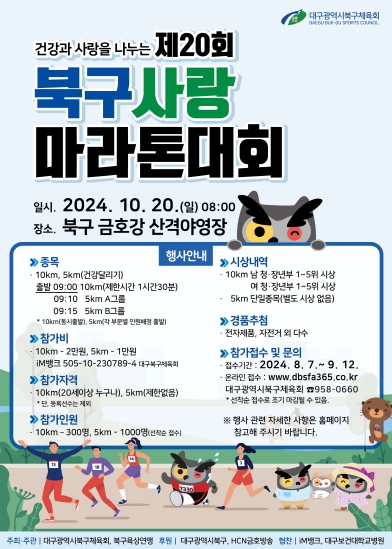 [뉴스서울] 제20회 북구사랑 마라톤대회가 오는 10월 20일 금호강 산격야영장 일원에서 개최되며, 참가 신청은 8월 7일부터 9월 12일까지 선착순으로 접수한다.