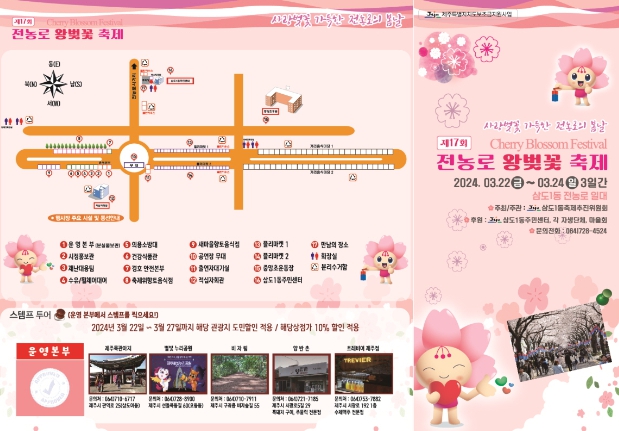 특히, 이번축제에서는 ‘전농로에 나를 담아라~ 사진 콘테스트’, ‘전농로 왕벚꽃 UCC/VLOG공모’ 등 이벤트와 도내 관광지 할인 등을 할 수 있는 ‘가즈아~ 푸른밤 제주도 스탬프 랠리’ 코너도 운영된다.