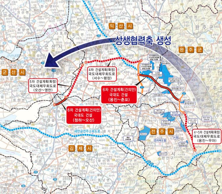 또한, 제4차 국도·국지도 건설계획에 추진 중인 서수-평장 국도대체우회도로 건설공사와 제5차 국도·국지도 건설계획에 건설 예정인 익산 오산-영만 국도대체우회도로, 이번 제6차 국도·국지도 건설계획에 익산시에서 건의한 김제 청하-익산 오산간 국도대체우회도로(총사업비 2,000억원, L=3km) 및 완주군에서 건의한 완주 용진-익산 춘포간 국도대체우회도로 노선까지 연계돼 국도대체우회도로가 완성된다면 경제적 파급효과는 더 커질 것으로 기대를 모으고 있다.