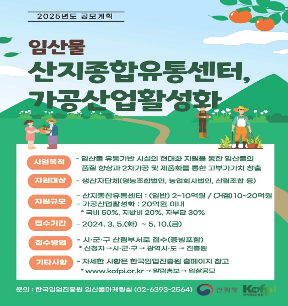 이번 사업은 영농조합법인, 농업회사법인, 산림조합 등 임산물 생산자단체를 대상으로 전체 사업비 2억~20억원(개소 기준, 총 5개소)을 지원하며 보조(국비,지방비) 70%, 자부담 30%이다.