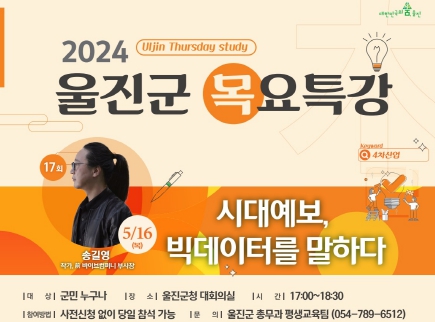 [뉴스서울] 울진군은 오는 16일 군청 대회의실에서 송길영 작가를 초청하여‘시대예보, 빅데이터를 말하다’라는 주제로 제17회 목요특강을 개최한다.