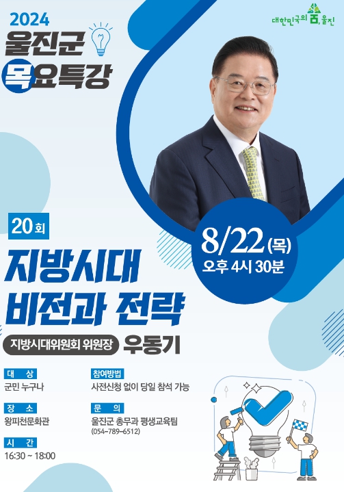 [뉴스서울] 울진군은 오는 22일 울진왕피천공원 내 왕피천문화관에서 우동기 지방시대위원회 위원장을 초청하여‘지방시대 비전과 전략’이라는 주제로 제20회 목요특강을 개최한다.