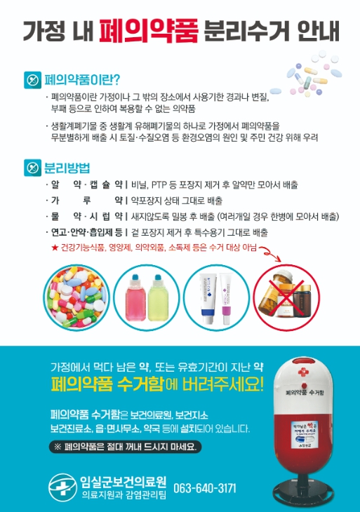 현재 임실군 관내 폐의약품 수거함은 보건의료원, 보건지소, 보건진료소, 약국, 읍·면사무소, 경로당 등에 총 88개가 설치·운영되고 있다.