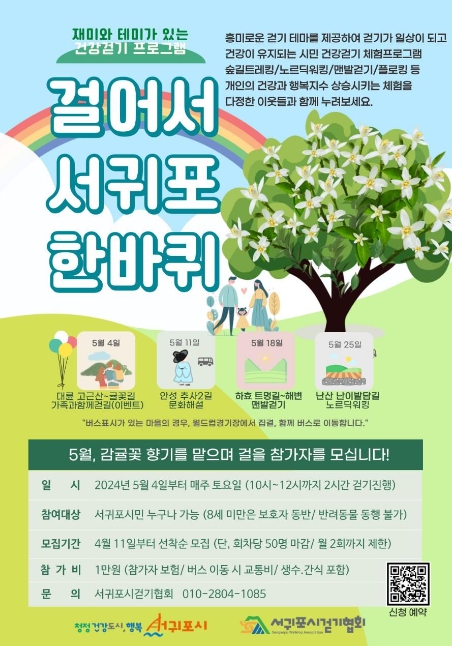 걸어서 서귀포시 한바퀴’5월 프로그램 일정은 5월 4일 ▶ 대륜 고근산~귤꽃길(가족과 함께걷길 이벤트), 5월 11일 ▶ 안성 추사2길(문화해설), 5월18일 ▶ 하효 트멍길~해변(맨발걷기), 5월 25일 ▶ 난산 난이밭담길(노르딕워킹) 코스를 테마별로 지역 특성에 맞게 운영한다.